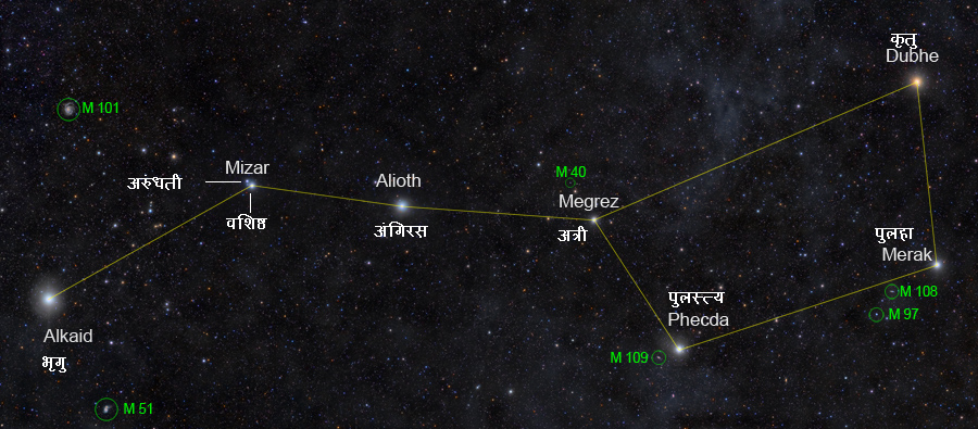 മരീചി, വസിഷ്ഠൻ, അംഗിരസ്സ്, അത്രി, പുലസ്ത്യൻ, പുലഹൻ, ക്രതു എന്നീ പേരുകളോടു കൂടിയ സപ്തർഷികളെ, ഉത്തരാകാശത്തിൽ കിഴക്കുനിന്നും ക്രമമായി കാണാം.അതിൽ വസിഷ്ഠനക്ഷത്രത്തിന്റെ അടുത്തായി കാണുന്ന ചെറിയ നക്ഷത്രമാണ് അരുന്ധതിനക്ഷത്രം.